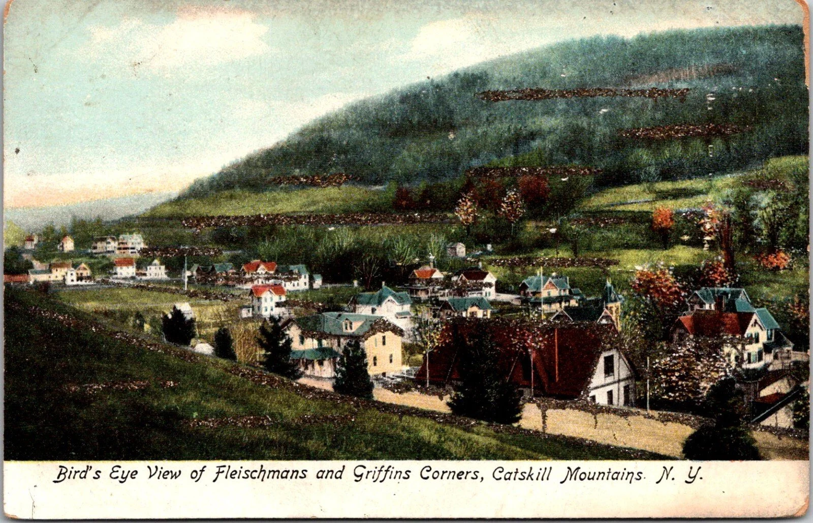 The Village of Fleischmanns was created in 1913, consolidating what had been two separate areas. Dating back to at least the 1830s, the hamlet of Griffin’s Corners grew on what is now the east end of the village. It was named after Matthew Griffin, an early settler and quite the jack-of-all-trades. Griffin was first Postmaster here, was a lawyer and ran a hotel and store, and even served in the State Assembly. The Griffin’s Corners Post Office opened in 1851.